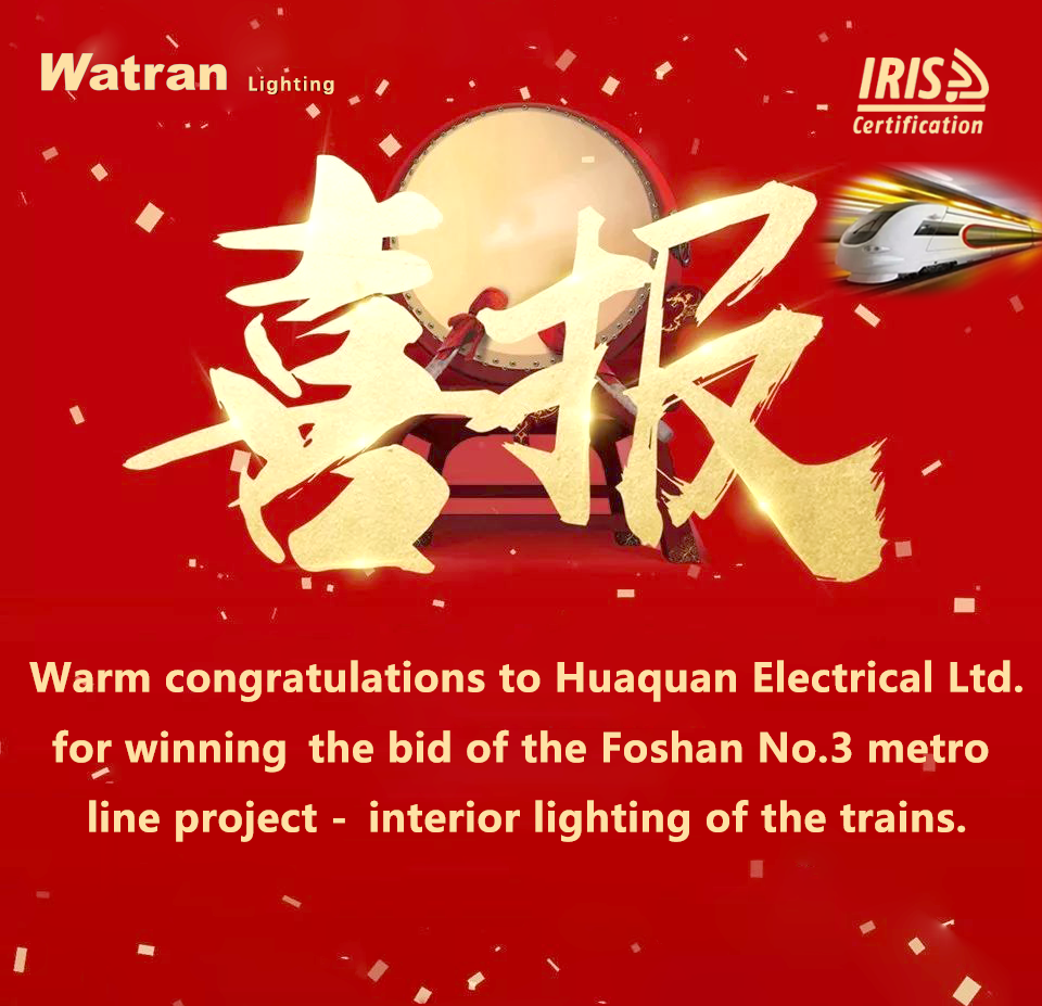 On April 22, Huaquan Electrical Ltd. received the "letter of award" from CRRC Qingdao Sifang Locomotive & Rolling Stock Co., Ltd., confirming that Huaquan is the winning bidder of Foshan No.3 metro line project -- interior lighting of the trains.